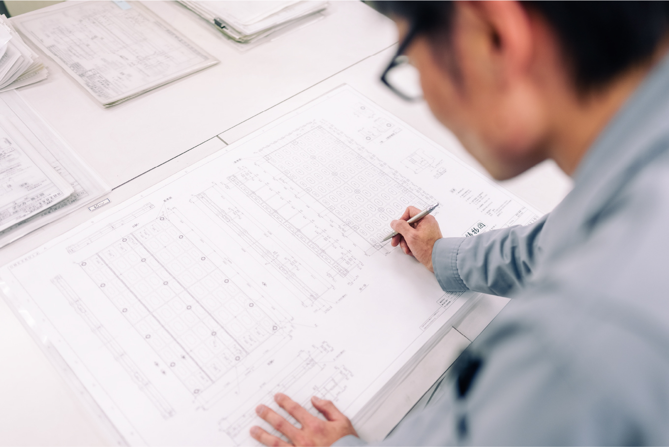 お客様の設備の一環を担う重要性を意識し、要求された仕様以上にご満足いただけるレイアウト、強度や剛性を検討し形にする―。技術開発の仕事はシンプルなようで、非常に大きい責任が伴う判断の連続です。私が手がけている商品は一人でつくるものではなく、何十トン、何メートルもする大がかりな製品です。さらには、その製品を用いて社会生活の基盤を支えるお客様に納品するため、誤りがあってはならないのです。自分の100%の力が、そこから関わっていくスタッフの100%になってしまいます。だから、私は誰よりも図面に向き合って、最も汗をかくリーダーであり、正しい判断ができる人でありたいのです。